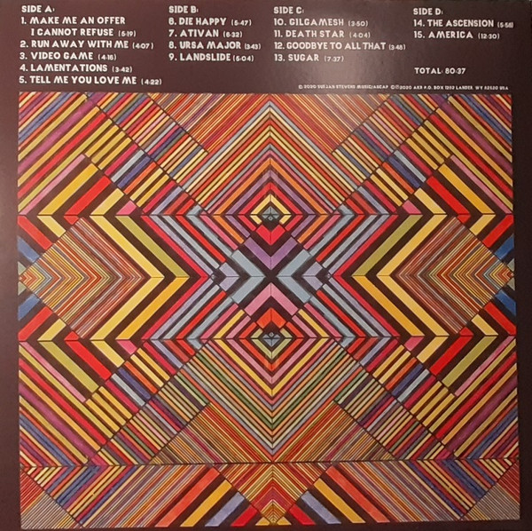 Standard black vinyl edition issued with 16-page booklet of original drawings by Sufjan Stevens, download card and printed inner sleeves. Packaged in a gatefold sleeve. © 2020 Sufjan Stevens Music/ASCAP © ℗ 2020 AKR P.O. Box 1282 Lander, WY 82520 USA [...] additional contributions recorded and engineered by James McAlister and Casey Foubert at their respective home studios. Contributions by Emil Nikolaisen were recorded at Malabar in Oslo, Norway, engineered by himself.