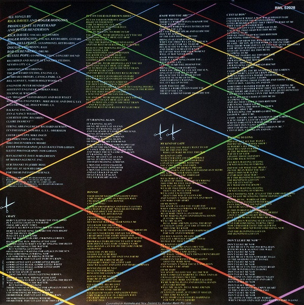 Released in an outer sleeve (printed in pink inside, with a white image of half a scissor printed along the open edge of each half of the sleeve); and an inner sleeve with lyrics and credits on one side. The lyrics are printed following the format originally used on [url=http://www.discogs.com/release/2068978]Crime of the Century[/url]: Rick Davies' name is in yellow, and Roger Hodgson's name is in white, in the songwriting credits on the inner sleeve; and the lyrics of the songs sung by the corresponding writers are printed in yellow and white. Labels are printed with a colour image of the hand wielding scissors from the front cover. On the side A label, the rope being cut has not been severed; on the side B label, the rope has been partially severed. Outer sleeve: ℗ 1982 A & M Records Inc., U.S.A. Manufactured under license by Festival Manufacturing Pty. Limited, and distributed by Festival Records Retail Marketing Division. A & M and Design is the registered Trademark of A & M Records Inc., Hollywood, Calif., U.S.A. and used by Festival Records Pty. Limited, under authorization. © 1982 A & M Records Inc., U.S.A. [THRU festival logo] Inner sleeve: Recorded and mixed at Unicorn Studios, Nevada City, CA. Additional recording: The Backyard Studio, Encino, CA. Rumbo Recorders, Canoga Park, CA. Bill Schnee's, North Hollywood, CA. Mastering engineers: Mastering Lab, Hollywood, CA. ℗1982 A&M Records, Inc. Labels: ℗ & © 1982 A & M Records Inc., U.S.A. Made in Australia by Festival Records Pty Ltd