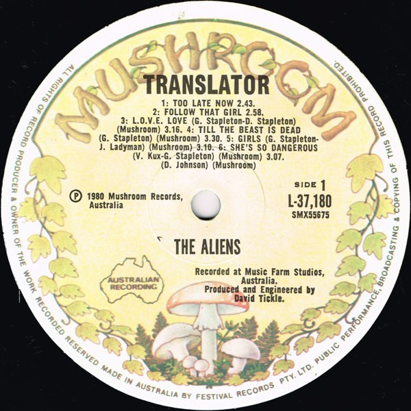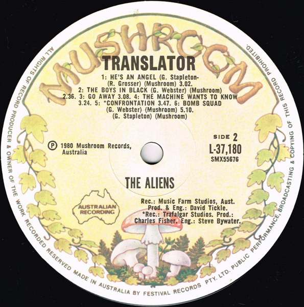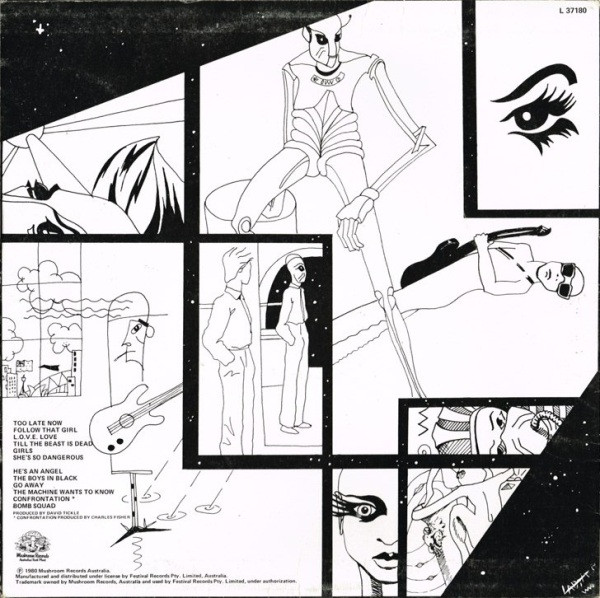 On external sleeve: ℗ 1980 Mushroom Records Australia. Manufactured and distributed under license be Festival Records Pty. Limited, Australia. Trademark owned by Mushroom Records, Australia and used by Festival Records Pty. Limited, under authorization. On inner sleeve: Recorded at Music Farm Studios Thanks to Desi & Rod for the photos. And to Paul KK for computer printouts. Copyright © 1980 Mushroom Music, Australia. On labels: ℗ 1980 Mushroom Records, Australia Australian recording[logo] Rec.: Music Farm Studios, Aust. B5: Rec.: Trafalgar Studios. (on label circumference) Made in Australia by Festival Records Pty. Ltd. Cat# L 37180 appears on the sleeve, cat# L-37,180 on the labels. Songwriter credits appear differently between the inner sleeve and the labels. Inner sleeve credits used for attribution here (the names are written out in full, whereas on the labels, they're abbreviated and only some are credited). Publisher credit to Mushroom, on the labels, is only written for tracks A3 TO B2, B6. Release-wide credit is mentioned on the inner sleeve (as a ©), pertaining to all tracks.