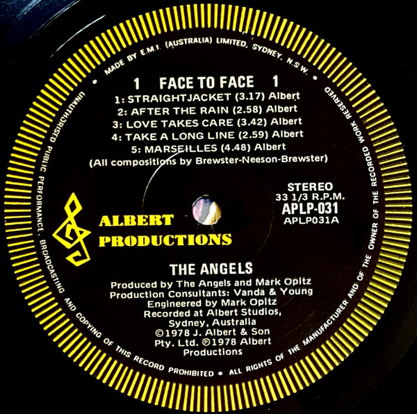 1980 reissue on black/yellow Albert Productions label. Sleeve: Recorded at Albert Studios, Sydney, Australia [Albert Productions logo]℗ 1978 Albert Productions © 1978 J. Albert & Son Pty Ltd [EMI logo]EMI Records Australia Manufactured and Distributed by EMI (Australia) Limited Labels: Made by E.M.I. (Australia) Limited, Sydney, N.S.W.