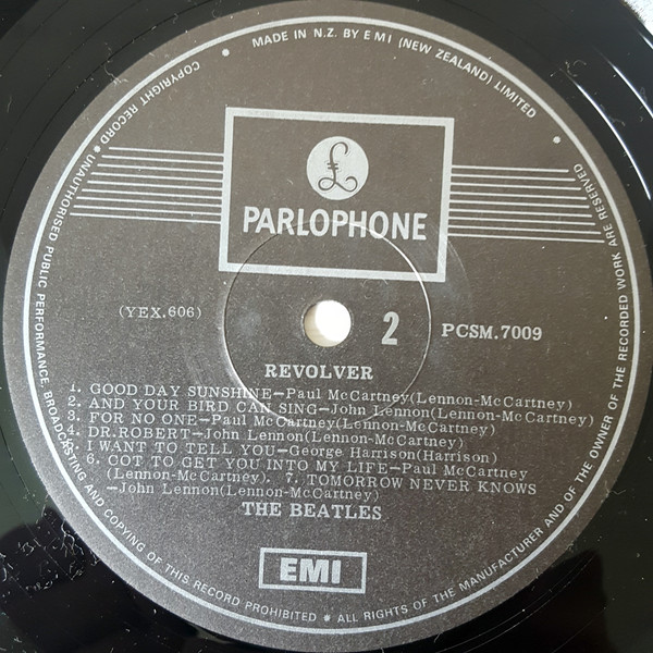 Black Parlophone Labels. Marketed By EMI New Zealand Limited P.O.Box 30-476, Lower Hutt ℗ 1966. There are several similar issues: - [r=11159970]: 1978 issue, same cover and labels, but original UK -1/-1 metal parts from 1966 were used (THIS VERSION) - [r=33490418]: 1981 issue, using a local cut made from new tape copies sent from UK on 26 June 1981 - [r=29345713]: 1981 export issue for Australia, using a local cut made from new tape copies sent from UK on 26 June 1981
