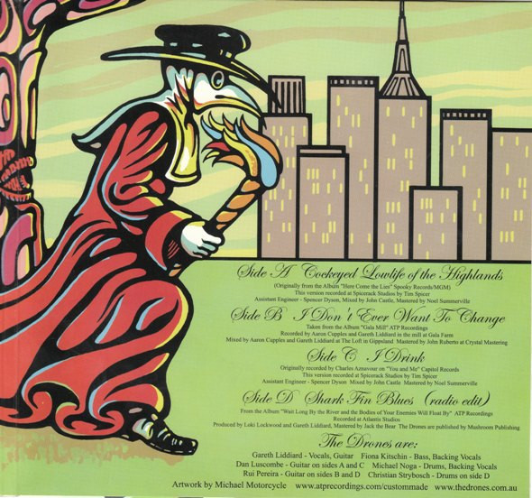 Side A recorded at Spicerack Studios. © and ℗ 2007 ATP Recordings. Side B recorded at the mill at Gala Farm, mixed at The Loft in Gippsland, mastered at Crystal Mastering. © and ℗ 2006 The Drones under exclusive license to ATP Recordings. Side C recorded at Spicerack Studios. © and ℗ 2007 ATP Recordings. Side D recorded at Atlantis Studios. © and ℗ 2006 The Drones under exclusive license to ATP Recordings. 1000 copies Gatefold cover