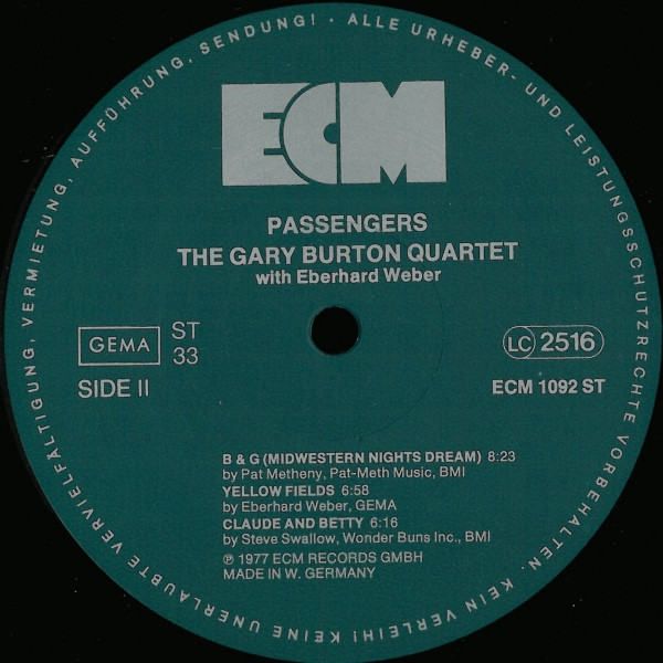 Back cover: Recorded November 1976 at Talent Studio, Oslo An ECM Production ℗ 1977 ECM Records GmbH Printed in W. Germany Disc labels: ℗ 1977 ECM Records GmbH Made in W. Germany cat# on back cover "ECM 1092" & "2301 092" (rear top right) cat# on disc labels "ECM 1092 ST"