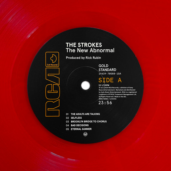 Indie Exclusive Opaque Red LP. Packaged in a PVC sleeve which lies within shrink-wrap. Barcode over-sticker applied to the shrink-wrap. Includes a custom inner sleeve, a foldout poster, and a download card. Track numbering is sequential across sides. All songs [...] © 2020 The Strokes Band Music (ASCAP), all rights administered by BMG Rights Management (US) LLC d/b/a BMG Gold Songs Except "Eternal Summer" [...] © 2020 BMG Gold Songs / The Strokes Band Music (ASCAP) and EMI Songs Ltd. c/o EMI Blackwood Music Inc. (BMI) - All rights administered by BMG Rights Management (US) LLC and Sony/ATV Music Publishing "At The Door" [...] © 2020 The Strokes Band Music (ASCAP) and Pvinny Music (ASCAP), all rights administered by BMG Rights Management (US) LLC d/b/a BMG Gold Songs "Bad Decisions" [...] © 2020 BMG Gold Songs / The Strokes Band Music (ASCAP), BMG Onyx Songs / Boneidol Music (GMR) and BMG Gold Songs (ASCAP) - All rights administered by BMG Rights Management (US) LLC Additional engineering [...] at Lucy's Meat Market Assistant engineers Rob Bisel & Dylan Neustadter at Shangri-La Kevin Smith at Groove Masters Recorded at Shangri-La Studios - Malibu, CA Additional recording at Studio City Sound - Studio City, CA Mauka View - Princeville, HI Lucy's Meat Market - Eagle Rock, CA Groove Masters Studio - Santa Monica, CA Joel and Zach's Studio - North Hollywood, CA Tracks A1, A2, A3 & B8 mixed [...] at Strongroom Studios - London, UK Tracks A4, A5, B6, B7 & B9 mixed [...] at Shangri-La Studios - Malibu, CA Mastered [...] at Marcussen Mastering - Los Angeles, CA Cover painting "Bird On Money" 1981 Artwork © estate of Jean-Michel Basquiat, licensed by Artestar, New York. ℗ & © 2020 RCA Records, a division of Sony Music Entertainment. Marketed and distributed by Sony Music Entertainment. Sony Music Entertainment International Services GMBH, PO Box 510, 33311 Gütersloh, Germany. Made in the EU