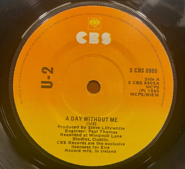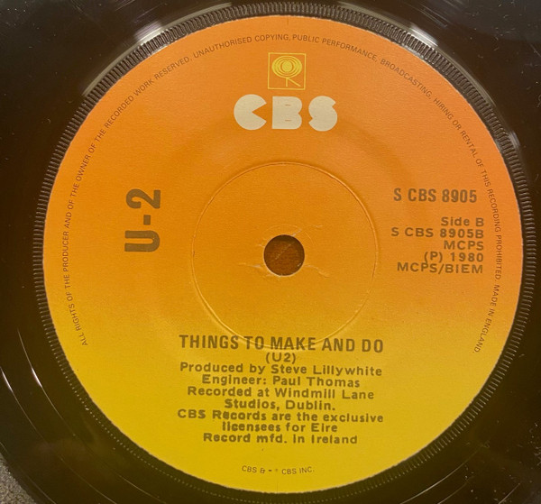 Side A: Does not have "CBS inc" on bottom of label nor "Made in England" on label rim. Side B: Has "CBS inc" and "Made in England" on label rim.. Translucent vinyl. Band name written as U-2 on the labels. Recorded: Windmill Lane Studio, Dublin MCPS (P) 1980 CBS Records are the exclusive licensees for Eire. Record mfd. In Ireland. CBS yellow/orange sunburst labels. Cat no. on sleeve: CBS 8905X. Cat no. on record: S CBS 8905.