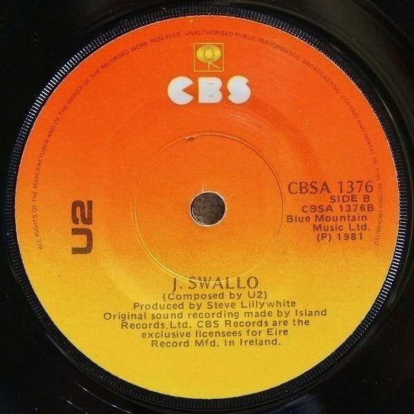 Second Release for U2 PAC II, with yellow orange sunburst CBS label. Track B reads "J. Swallo" on both cover and label. Blue Mountain Music Ltd. (P) 1981 Original sound recording made by Island Records Ltd. CBS Records are the exclusive licensees for Eire Record mfd. in Ireland