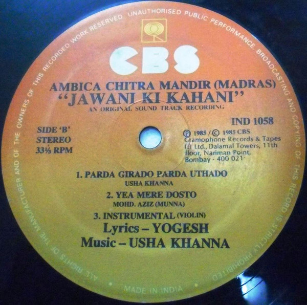 Ambica Chitra Mandir (Madras) "Jawani Ki Kahani" An Original Soundtrack Recording © 1985 ℗ 1985 CBS Gramophone Records & Tapes (India) Ltd.