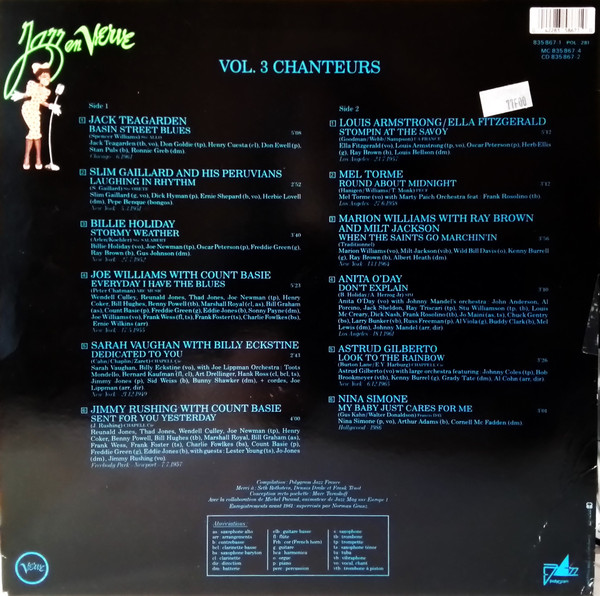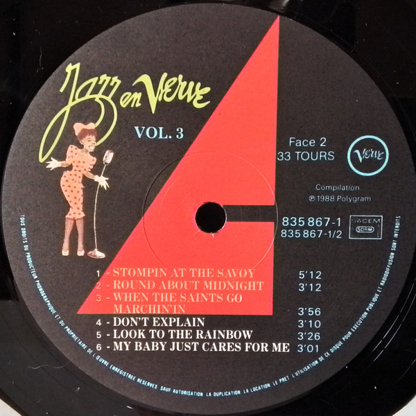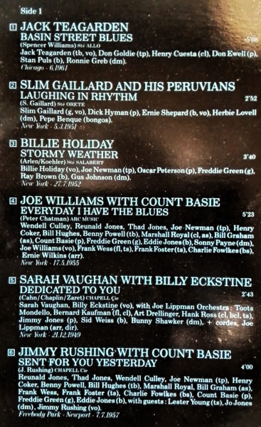 Ⓟ 1988 Merci à [a554195], [a391812] et [a817662] Avec la collaboration de [a651260] Runouts are hand-etched. Recording dates: A1: Chicago, June 1961 A2: New York, May 3, 1951 A3: New York, July 27, 1952 A4: New York, May 17, 1955 A5: New York, December 21, 1949 A6: Freebody Park, Newport, July 7, 1957 B1: Los Angeles, July 23, 1957 B2: Los Angeles, June 27, 1958 B3: New York, January 13, 1964 B4:Los Angeles, January 18, 1961 B5: New York, December 6, 1965 B6: Hollywood, 1986