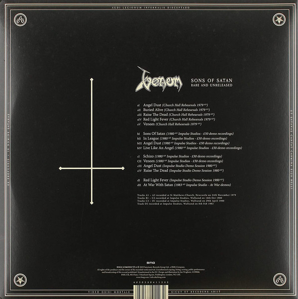 Clear black splatter vinyls. Gatefold jacket. Although the hype-sticker advertises that this "Includes new interviews with Cronos, Mantas and Abaddon", nothing is included. Apparently this was a mistake. The CD version however does include the interviews. The number of the pressing limitation is unknown. Tracks A1-A5 recorded at St. Matthews Church, Newcastle on 24th November 1979 Tracks B1-C2 recorded at Impulse Studios, Wallsend on 10th October 1980 Tracks C3-D1 recorded at Impulse Studios, Wallsend on 29th April 1980 Track D2 recorded at Impulse Studios, Wallsend on 6th February 1983 On hype-sticker: 15 previously unreleased demo tracks fromVenom's formativeyears and finally unleashed on double splatter vinyl. On back cover: ℗ & © 2019 Sanctuary Records Group Ltd. Manufactured in the EU. First release in UK on May 29th, 2020. EU release on 08/28/2020.