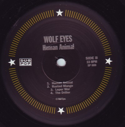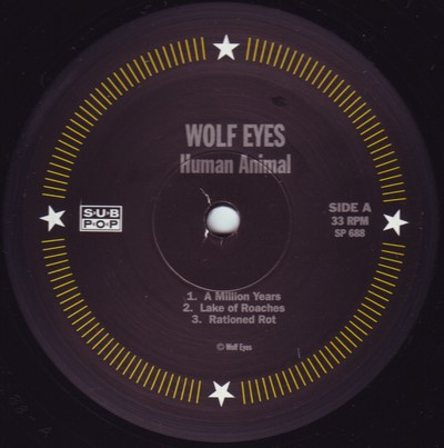 "Mastered at" RTI is for "Processed at". Processing company and lacquer cut facility uncredited, identified with matrix. Some (or all) copies have a sticker on front sleeve with artist name and title, in addition to the stylized 'Wolf Eyes' black logo.